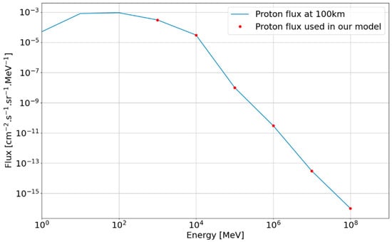 Discretization of the proton spectrum at 100 km of altitude based on the Swordy plot by William Hanlon [36] and the CRDB.