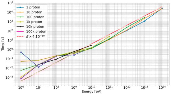 - The calculation time: one proton of 100 TeV took, on average, 7 h to simulate on the CNES cluster, as shown in Figure 9. In total, we simulated for more than 300 million seconds equivalent 1 CPU (~10 years) in the CNES cluster.