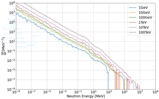To be able to create a database of EAS transfer in the Earth atmosphere, we started by compiling all the results of our simulations by altitude and by particle, for a given energy of a primary proton. Then, we created an average response for each energy based on a Monte Carlo simulation, the , with being the quantity of particles in the energy bin , the kind of secondary particle at the given altitude . As an example, we plotted in Figure 10 the spectrum for neutrons at 18 km of altitude. We can observe that the energy response is similar for each energy but that a more energetic primary creates more secondary neutrons. Moreover, higher energetic primaries create more secondaries, allowing better statistics to be obtained.