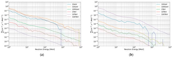 Spectrum of secondary neutrons according to the energy of the incident proton generated by each part of the primary particles spectrum given in Figure 8 at two altitudes: (a) at 18 km and (b) at 7 km.