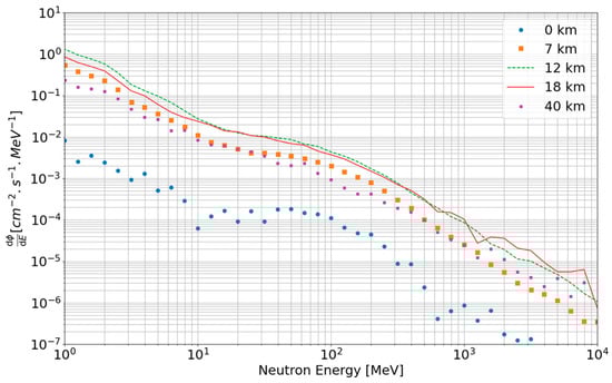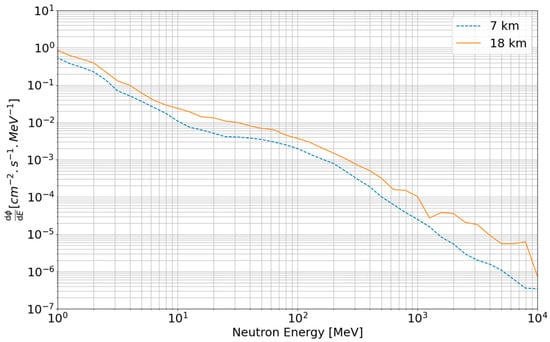 Finally, by compiling all the energy responses, we get the spectrum plotted in Figure 12 for the secondary neutrons at 18 km and at 7 km based on the primary spectrum from Figure 8 (see Equation (1)).