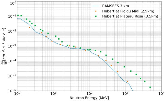 In Figure 14, we compare RAMSEES results with the experimental data from two different instruments. The first set of data was collected at Pic du Midi, France (2.9 km of altitude) from May 2011 to 2018 with a Bonner Sphere System (BSS) neutron spectrometer and the second one at Plateau de Rosa, Italy (3.5 km of altitude) in January 1998 with a Bubble Detector Spectrometer, a passive system, by Hubert et al. [41]. The Pic du Midi experiment collected data for 8 years. When comparing our predictions at 3 km and the in-situ data at Pic du Midi, we need to consider that there is a difference of 100 m of altitude between them. Despite the 100 m of altitude difference, RAMSEES shows a good agreement with the data from Pic du Midi with less than a factor 1.55 of difference. In the case of Plateau Rosa, we observe a factor 2.38 of difference between RAMSEES model and the experimental data below 1 GeV. However, there are two main factors to consider here. First, the data were acquired during one month at a solar minimum, implying a maximum of atmospheric radiation, and secondly, the 500 m of altitude of difference influences the spectrum, making it higher in the case of Plateau the Rosa than at 3 km. At higher energies than 1 GeV, we observe a divergence between our prediction and the in-situ measurements. We think the divergence is caused by the solar minimum allowing more cosmic rays to enter the Solar System and the Earth’s atmosphere. All together, we can say that the RAMSEES model fits with the experimental data at 2.9 km but shows discrepancies at 3.5 km. The comparison of a worst-case scenario (solar minimum) to the 3.5 km data should be interesting to do to extend the validation of RAMSEES.
