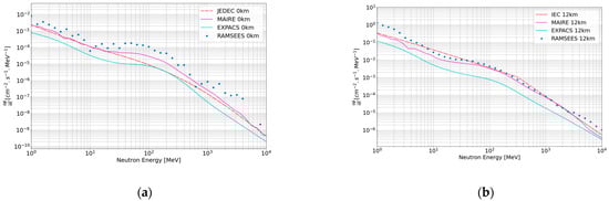 RAMSEES spectrum of secondary neutrons at several altitudes compared to standard and to the models MAIRE & EXPACS: (a) ground level compared to JEDEC; (b) 12 km of altitude compared to IEC.