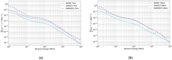 Spectrum of secondary neutrons compared to EXPACS and MAIRE at several altitudes: (a) at 7 km and (b) at 18 km.