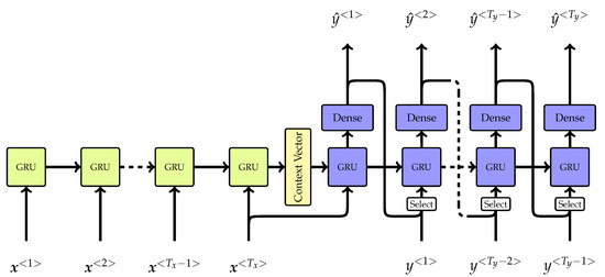 where is the hidden state of the encoder at time t, is the hidden state at the previous time step, is the input vector at the current time, and is the weights vector. The function f represents a neural network, which can be a simple Recurrent Neural Network (RNN) [20,21] or a more complex Gate Recurrent Unit (GRU) [19,20,22] or a Long-Short Term Memory (LSTM) [19,20] network. At the final time step, , the hidden state of the encoder is defined as the context vector as follows: