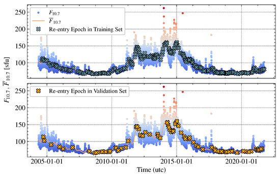 Re-entry epochs in training (Top) and validation (Bottom) sets and solar flux indexes.