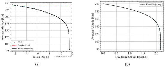 where is the re-entry time, and , , and , are the parameter obtained through curve fitting using the Levenberg–Marquardt algorithm, which is available through the Python library, SciPy [29]. The first coefficient, , is equal to 80 km, which is the reference altitude at which TIP messages are provided [6]. This assumption avoids the fitting algorithm changing the re-entry epoch from the TIP message and, therefore, ensures consistency with the TLE data. Subsequently, the epoch corresponding to an altitude of 200 km is set as the initial epoch so that the time span from the starting altitude of 200 km to the re-entry at 80 km, identifies the residual time.