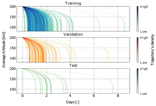As each object will have different residual times, it is convenient to interpolate the residual time as a function of the average altitude. To do so, we subdivided the considered altitude range (between 200 km and 80 km) into a uniform grid of 25 points. Consequently, each trajectory was identified by a series of observations , with , where represents the average altitude and the relative epoch. In this way, it is possible to use only as the output of the deep learning model. Figure 4 shows a result of such a procedure for the object identified by NORAD 27392. The resulting trajectories are represented for the training, validation, and test sets are represented in Figure 5. It can be seen that there is a concentration of trajectories characterised by residual lifetimes between 0.5 days and 3 days. Meanwhile, only three trajectories with residual lifetimes higher than 6 days are present, and only two of them were used for training. This is important because this distribution incorporates the ballistic coefficient information and it can be directly related to the prediction capability of the model. We also note that, in the test set, the leftmost trajectory has a residual time of roughly 14 min and it is associated with the Molniya 3-39 spacecraft. In this case, the trajectory is highly elliptical and does not satisfy our selection criterion defined in Section 3; however, it was included in the test set to assess the capabilities of the model with such trajectories.