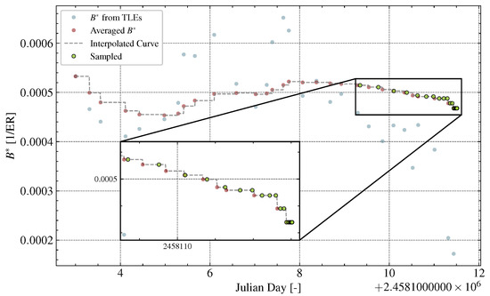 where is the atmospheric density at the perigee of the orbit, assumed as ; and the Earth radius of 6378.135 km. In general, the coefficient of the SGP4 formulation soaks up different modelling errors. Despite the fact that the ballistic coefficient can be retrieved from , they are not identical. However, in this context, we assumed that can be used as a proxy of B as we were considering objects with similar orbital parameters that will be subject to similar modelling uncertainties. Similarly to the average altitude, it is essential to pre-process the data in order to feed them to the RNN. The first step of the processing consists of defining a sliding window with a fixed size to create a series of average values, in which each term is given by the average of all the previous points. The second step consists in applying a linear piece-wise interpolation scheme, in which, between two consecutive values, the preceding one is kept constant. Subsequently, the interpolated curve was sampled at the epochs defined through the average altitude processing. An example of the aforementioned procedure is represented in Figure 6 for NORAD 27392.