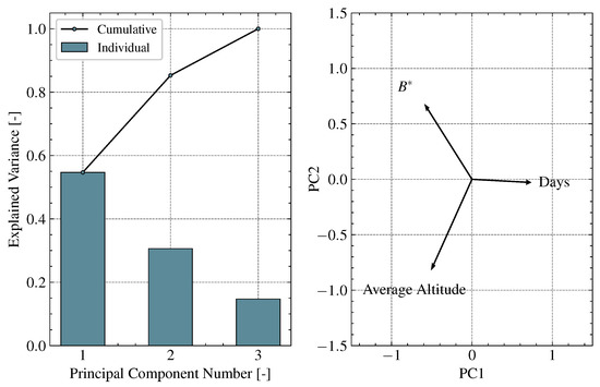 Given the features generated so far, it is possible to apply the PCA to observe if the expected relations between the , the residual time in days and average altitude exist. The results of the analysis are summarised in Figure 7. Focusing on the loading plot and the PC1, the feature related to the time has a strong positive loading; meanwhile, the others have negative loadings. Indeed, the time feature can be seen as a synonym of the residual lifetime, therefore as the increases, the lifetime of an object decreases due to the drag acceleration growth. Furthermore, the altitude-time relation is associated with the altitude decrease, as time proceeds.