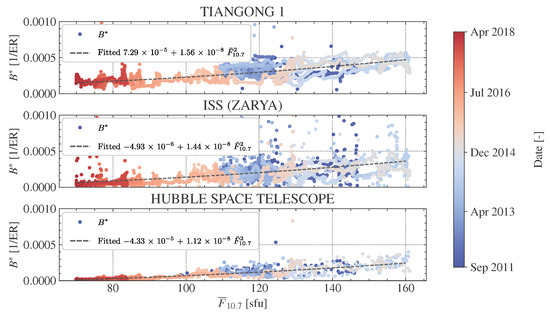 as a function of the mean solar index for Tiangong 1, ISS and HST.
