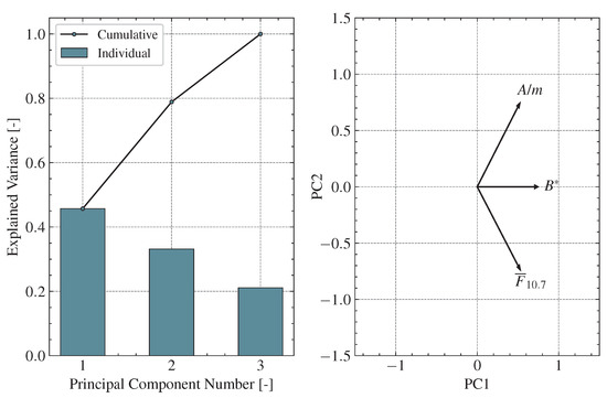 Similarly to Section 4.1 and Section 4.2, it is possible to explore the features generated so far in order to find if the expected relations can be found. To this aim, the PCA can be applied considering the index, the and the area-to-mass ratio. The results are summarised in Figure 9. From the loading plot, it can be seen that, along PC1, all the variables are characterised by positive loadings. In particular, the relation between the and the is related to the drag-like coefficient definition. The relation between the and the solar index is the same as discussed in Figure 8, where a positive correlation is present. Moreover, the relation between the area-to-mass ratio and the can be explained through the .