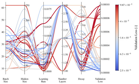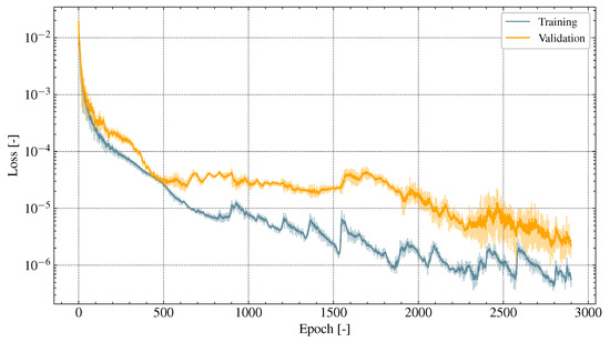 Finally, it is also necessary to specify the parameters for the ASHA algorithm. Table 6 shows the aforementioned parameters and the selected values. Specifically, the total number of trials refers to the amount of hyperparameters combinations the algorithm attempts before stopping, the reduction factor represents the fraction of trials removed after each run and the grace period that corresponds to the epochs for which a trial must be trained before halving. These values have to be selected considering the computational resources of the hardware and the expected results. The most suitable parameters, which were found with a trade-off between results and computational time, are represented in Table 6. It has to be noted that a small grace period may bias ASHA towards those solutions that converge quite rapidly but do not lead to the best performances. Therefore, a good compromise is experimentally found to be at 400 epochs. Furthermore, the maximum value of the training epoch is set at 2100 because it was observed that the optimal value is typically above 2000.