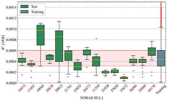 Table A1 shows the NORAD IDs of the test set objects subdivided into Category 1 and Category 2. Category 1 contains objects with a median within the interquartile distance of the distribution of the training set, while objects in Category 2 have a median outside this interval.