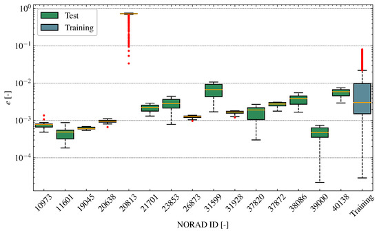 By inspecting Figure 11, it can be seen that the distribution of 20813 is characterised by a large range of values. However, its interquartile is lower than 19045, and the model has proved itself to provide acceptable performances on the latter, with an output that accurately follows the true one. Therefore, it appears that the drag-like coefficient cannot be directly linked to bad performance. Indeed, 20813 is characterised by high values of eccentricity, as highlighted in Figure 12. This makes the nature of the re-entry different, and the model is not capable of acquiring this knowledge because it is not trained for it. Therefore, the prediction capabilities have to be related not only to the but also to the eccentricity.
