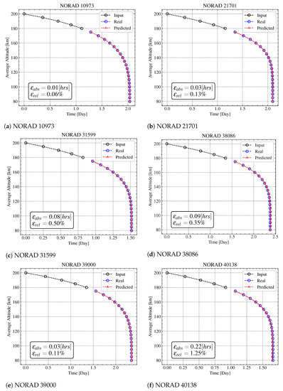 Figure 14 shows the trajectory prediction for selected objects of Category 1 in the test set. The black curve represents the input average altitude (the initial 5 elements of the input sequence, ), the red line represents the predicted sequence, and the blue trajectory defines the true output (as obtained from TLE data).