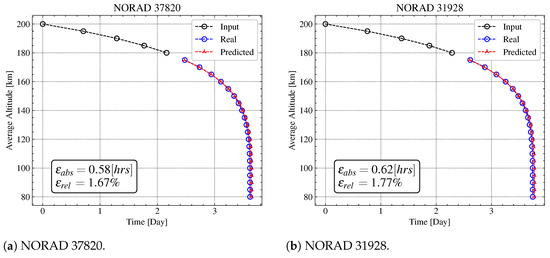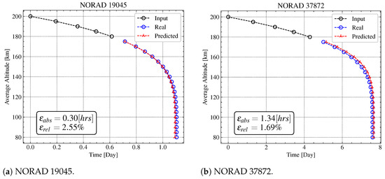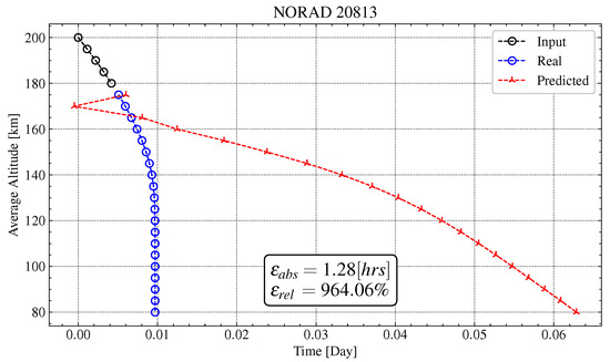 Starting from the objects of the first category, Table 8 represents the predictions’ errors for all the different starting altitudes defined in Table 3. Generally, it can be seen that the model is successfully capable of predicting the output trajectory and therefore the re-entry epoch. For example, 39000 shows an absolute error that is less than 2 min, roughly 24 h before the re-entry. Furthermore, this error stays confined below roughly 3 min, for all the predictions. This behaviour is related to the similarities of the distributions of each object with respect to the one of the training set. Indeed, it should be highlighted that the highest absolute error is 14 min and it is associated with 40138. Moreover, observing the MSEs, all the relative errors lay between and , showing that the similarities of the are associated with excellent performances. It is interesting to note that, comparing the different cases, the MSE decrease does not necessarily correspond to a lower absolute error, as for example in 11601 and 39000. This indicates that better results could also be obtained by selecting a different loss function.