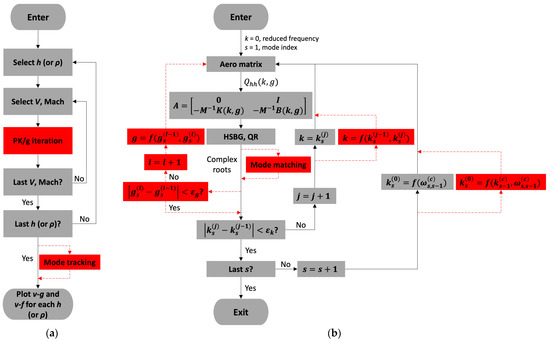 Flow chart of the PK-method, adapted from Bellinger [28]. The right plot (b) represents the PK-iteration process in the left plot (a). Grey: original processes in NASTRAN; Red: developments in this study.
