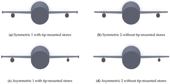 After verification using the simple wing model, the improved methodologies were applied to four real-world jet aircraft configurations with underwing and possible tip-mounted stores: two symmetric and two asymmetric configurations as illustrated in Figure 6. The stores represent any objects such as external fuel tanks, weapons, and special electronic sensors or devices. The results were compared with those obtained from NASTRAN.