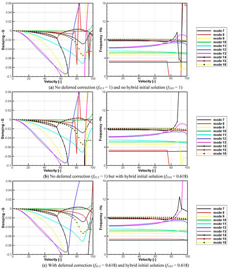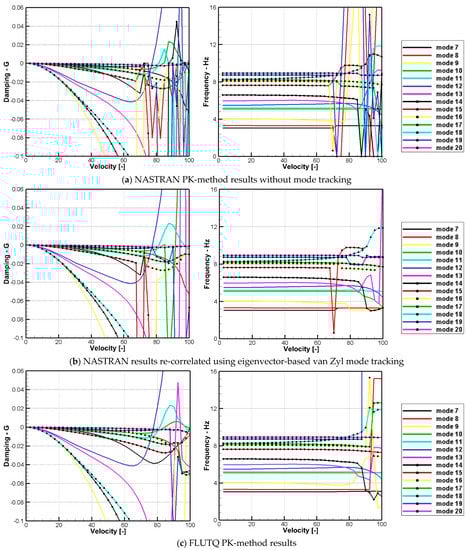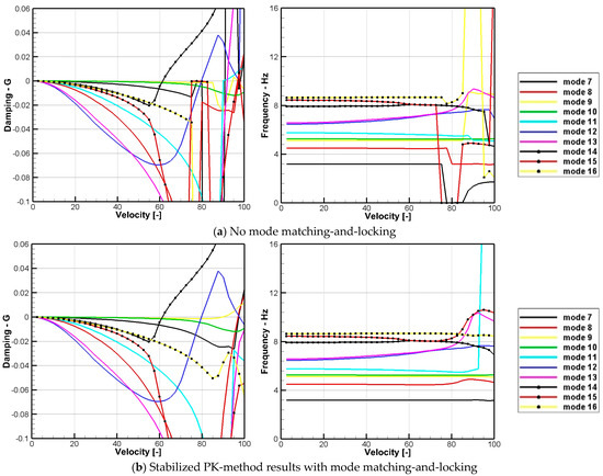 Figure 9 further demonstrates the effects of the individual numerical techniques. For simplicity, the figure only displays the first 10 flexible modes. The results shown in Figure 9a demonstrate a test case for which no mode matching-and-locking procedure was used in the PK iterations, confirming that mode matching-and-locking is a key element to stabilize the solution.