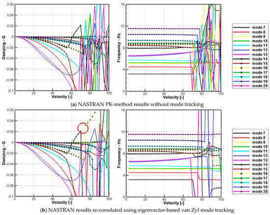 Figure 7 shows impacts of the van Zyl [16] method when it was applied as a post-processing mode-tracking procedure to the Symmetric 1 configuration of a real-world complex jet aircraft. The PK-method flutter analysis was conducted using 80 vibrational modes. The first six modes were rigid-body modes. For clarity, the figure displays only the first 14 flexible modes (modes 7–20). The airspeed was arbitrarily normalized in the velocity–damping (v-g) and velocity–frequency (v-f) plots. The computed damping coefficient G(g) indicates the artificial structural damping required to damp the oscillation caused by the interaction between the aerodynamics, structural mechanics, and dynamics. Negative values indicate a stable aeroelastic state while positive values indicate flutter occurrence that requires structural damping to suppress the oscillations. The predicted lowest flutter speeds were Vf = 77.35% from NASTRAN and Vf = 77.54% using FLUTQ, with a frequency of 5.69 Hz at g = 0. The principal flutter modes were mode 12 (Antisymmetric Wing First Bending) and mode 14 (Antisymmetric Underwing-Store Pitch). As shown in the figure, the mode-tracking algorithm as a post-processing procedure did not change the flutter prediction results, which was expected. However, it sorted the results and significantly reduced the amount of severe mode switching, thus alleviating confusion in the interpretation of the flutter results. Note that the FLUTQ PK-method results showed less mode switching when compared with the NASTRAN PK-method results.