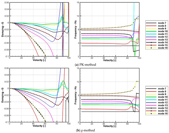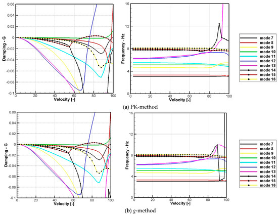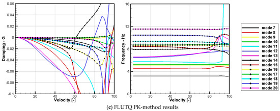 The effects of the deferred scheme and the hybrid initial solution on the results were not as obvious as the mode matching-and-locking mechanism. In general, Equations (16) and (13) worked well for most test cases (when other techniques developed in this study were applied). However, introducing the deferred correction scheme in Equation (17) and the hybrid initial solution approach in Equation (14) using under-relaxation parameters alleviated mode switching in the post-flutter region, as evidenced in Figure 10. Mode 15 appeared as a hump flutter mode that crossed g = 0 shallowly and then re-crossed to the stable side of the v-g plot. Hump flutter modes are most commonly observed in store flutter. The damping of mode 15 was far below 0.02 (an assumed inherent structural damping commonly used in industry) and was believed unlikely to produce explosive flutter. Therefore, the predicted flutter speed was Vf = 75.54% with a frequency of 7.29 Hz when crossing g = 0. The principal flutter modes were mode 12 (Antisymmetric Underwing-Store Pitch) and mode 14 (Antisymmetric Fuselage First Bending). Figure 10a,b show more mode switching, which was mainly attributed to numerical divergences in the post-flutter region when compared to Figure 10c. The under-relaxation parameters provided an additional option to control the numerical stability in the PK iterations.
