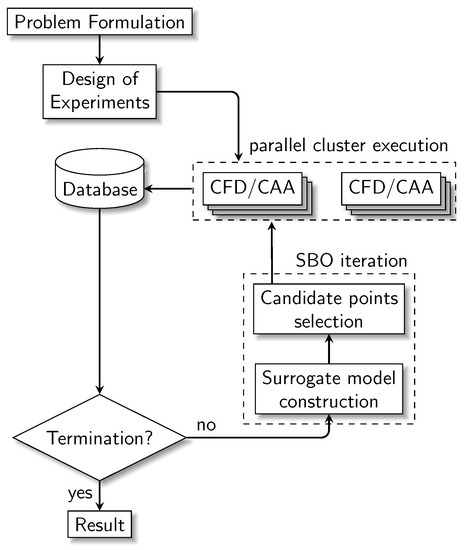 The use of surrogate modeling-driven optimization allows the use of global search methods, which use cheap surrogate prediction instead of direct calls to J. A general procedure for SBO, presented schematically in Figure 1, is: