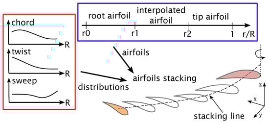 In propeller optimization with a fixed radius and number of blades, the remaining geometry features consist of chords, twists, and airfoils along the stacking line. A common choice of geometric parameters consists of chord and twist distributions along the radius. Sweep and thickness are often added to allow additional design freedom. 15-variable spline-based parametrization (five parameters for the chord, twist and sweep distributions each) was successfully used in aeroacoustic optimization [10]. In [17], the parametric model of the blade was built using variable: chord, twist, sweep and dihedral at three radial locations along the blade. While the shape of airfoils is typically less influential in terms of aerodynamic performance than the platform parameters, it can be optimized either in a single process, or in a separate step—after completing the platform design [7]. The latter process reduces the dimensionality of the optimization problem.