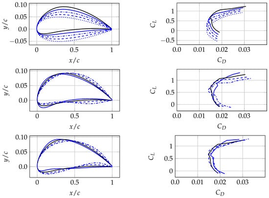 Airfoil parametrization aimed to allow major modifications to airfoil properties with as few parameters as possible. Consequently, the parametric model was built on a baseline airfoil, with modifications to maximum camber value and chordwise positions of maximum camber and thickness. The modification of these parameters allowed us to exploit a relatively large design space. Figure 3 presents the example effect of the described modifications on the NACA4412 airfoil scaled to 10% thickness. Three perturbation types are presented: maximum camber change, maximum camber position change, and maximum thickness position change. The resulting airfoils are presented in the left column, whereas the corresponding XFOIL predictions, performed at , are presented in the right column. The camber modification gives the capability of achieving the desired at a minimum . The maximum camber and thickness positions are parameters changing the behavior of the lift–drag curve. It should be emphasized that not only may the three presented airfoil modifications occur simultaneously, but also that the chord and twist distributions are subject to a global optimization. What is more, the rotating motion of the propeller blade is complex and—especially in the tip region—might result in operating conditions that cannot be captured with two-dimensional airfoil analysis.