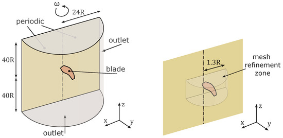 The computational model of a single blade was used, due to the periodic nature of isolated propeller analysis. The computational domain extends 24 radii in the blade direction and 40 radii in the upstream and downstream directions. A single rotating reference frame approach was used to model the propeller rotation. Hover was modeled with pressure–outlet boundary conditions on the non-periodic boundaries of the domain. The setup is presented schematically in Figure 4.