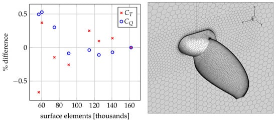 The need for blade-resolved CFD used in this study was dictated by two factors. Firstly, the hover operating conditions imply strong interaction of the flow around the blade with the wake of the preceding blade. These three-dimensional phenomena require appropriate modeling, which rules out the use of cheap blade element-based methods. While comparisons between low and high-fidelity models can be performed [28] to establish sources of low-fideity errors, the use of high-fidelity codes remains inevitable. Secondly, the optimization perspective implies the method must be robust and give accurate results for different input geometries. As a consequence, the simplified methods—based on the two-dimensional airfoil data [29]—give correct results only in a limited operating regime. The modeling approach presented in this section aimed to exploit advantages of blade-resolved CFD while keeping the computational cost as low as possible.