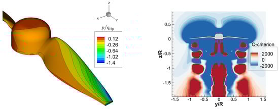 Nondimensional pressure on the blade surface of the benchmarked propeller blade (left), and -plane vortices visualized by the q-criterion (right).