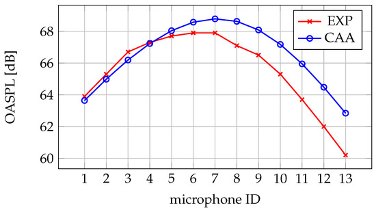 The noise prediction validation is presented in Figure 7. The experimental setup consisted of 13 uniformly distributed microphones located in a line (four propeller diameters) away from the rotation axis. Microphones are numbered from 1 to 13, from the most downstream microphone 1 located below the plane of rotation, through the in-plane microphone 7, up to the most upstream microphone 13 located above the plane of rotation. A very good agreement between experimental and CAA results was obtained for microphones downstream of the propeller, with increasing discrepancy as the observation point moves upstream. The trends are correctly captured with the highest OASPL at microphone 7 and lower values upstream than downstream. Given the simplicity of the computational method, along with the aforementioned simplification in turbulence modeling, this result is satisfactory.