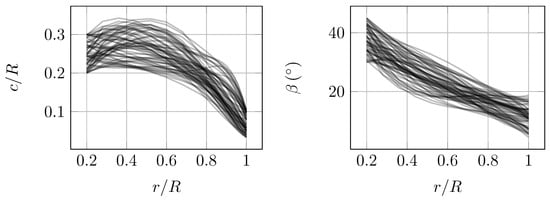 The resulting chord and twist distributions of the initial sample are visualized in Figure 8. It can be observed that a large search space was investigated in this study. The need for such variation in blade size (i.e., chords) and twist was dictated by the variable rotational speed, which has a large influence on the resulting forces. Three randomly selected samples from the initial sample are visualized in Figure 9.