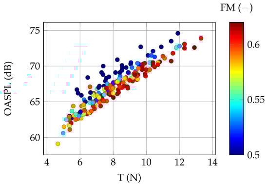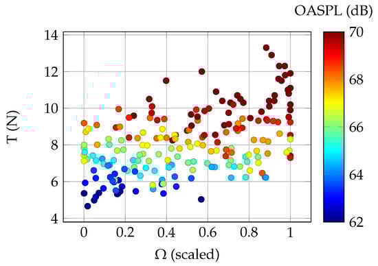 The initial sample consists of 200 points sampled in the design space of 20 variables. The current study is focused on finding the aeroacoustic optima which provide 8 of thrust in hover. The analysis of Figure 10 ensures that a propeller providing sufficient thrust can be found for any rotational speed between 4200 and 5000 rpm (for convenience scaled to 0–1 in the plot). The thrust range for any rotational speed within bounds is around 6 with a minimum of around and the maximum exceeding 13 . A gentle trend of increasing OASPL with increasing rotational speed for a given thrust is noted.