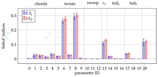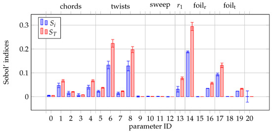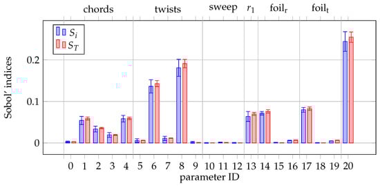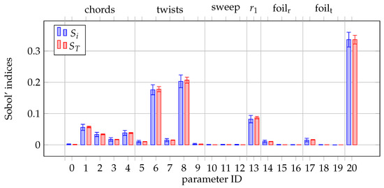 Sensitivity analysis—commonly divided into local and global—describes relations between input and output uncertainties [18]. Local sensitivity is described by derivatives at a point of interest. Global sensitivity requires information in the whole range of input variables, and allows thorough analysis of a system, including quantification of parameter influence on the output, as well as identification of interactions between parameters. In the optimization context, global sensitivity analysis quantifies the importance of variables on the objective function. Hence, it allows us to remove unimportant variables, tune bounds, and eventually build efficient parametric models. In surrogate-based optimization, such information might be available from the surrogate model, e.g., if the surrogate model is based on an anisotropic kernel. An example of this approach was presented on a wing design case study [19], where tuned kriging hyperparameters were used to assess the relative importance of geometric parameters. Where the interactions between parameters are sought, a global sensitivity study should be performed. A method allowing more in-depth understanding of global sensitivity is the method of variance decomposition [20], leading to the Sobol’ indices-based analysis. This approach was used to determine the relative influence of parameters in aerodynamic propeller optimization [21] and in an airfoil optimization for improved dynamic stall behavior, and therefore to determine parameters of the highest importance [22]. Sensitivity analyses—usually not considered for optimization problems described in the literature—provide valuable information, which can be used in future design cases.