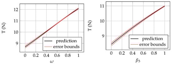 High prediction accuracy of surrogate models built from a relatively sparse sample in a multi-dimensional space was attributed to the relatively simple model output landscape. Figure 16 presents predictions along with the prediction error of the two most active variables in the model— and . The values of remaining parameters are fixed to the mean value (between the lower and upper bounds). The total thrust difference within the rotational speed exceeds 3 , which is expected from the analysis of the initial sample in Figure 10. Changing from the minimum to the maximum results in a thrust change of approximately . These predictions are consistent with the global sensitivity analysis presented in the previous section.