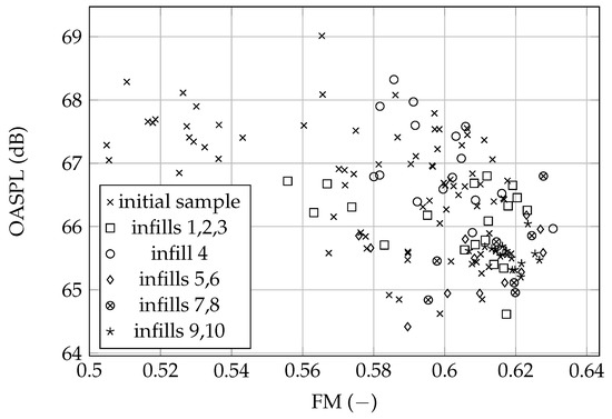 The optimization process was terminated after 12 iterations, as no new point was added to the Pareto front for two consecutive iterations. The lack of improvement was attributed to the surrogate prediction error and a very tight margin for potential improvement. The aeroacoustic Pareto front, presented in Figure 17, turned out to be very narrow—the difference between OASPL-optimal and FM-optimal designs was approximately dB and just above 0.01 FM counts. The point minimizing OASPL with a FM approximately 0.59, theoretically being Pareto optimal, extends the FM range. However, it offers very little improvement in OASPL compared to the second-best. Consequently, it is unlikely to be considered as a practical solution.