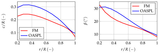 Figure 18 presents distributions of chord and twist along the radius for the FM- and OASPL-optimal propellers. Major differences can be observed: the FM optimum has a higher aspect ratio and lower twist, especially in the inboard part of the blade. The design rpm, i.e., rotational speed required to achieve the target thrust, is 4740 and 4250 for the FM and OASPL optima, respectively. Airfoils used to define the stacking of both propellers are presented in Figure 19. The camber of the root airfoil is significantly higher in the FM-optimal design, which explains the difference in twist. The tip airfoils have a similar camber magnitude, which is expected, as the twist distribution is similar near the tip.
