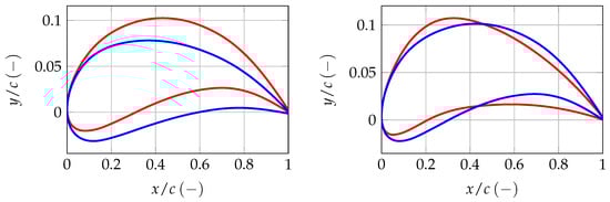 Root (left plot) and tip (right plot) airfoils used to define the airfoil shape along the radius for the FM—(red line) and OASPL—(blue line) optimal designs.