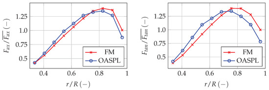 The axial and tangential force distributions along the radius, computed from the CFD model, are presented in Figure 20 for FM and OASPL optima. It can be observed that the OASPL optimum has the loading shifted towards the rotation axis, compared to the FM optimum. Similarly, peak values are higher for the FM optimum. These trends are expected, as noise reduction is achieved by lowering peak pressure, which is the highest near the tip. It should be noted that the differences in the distributions of dominating axial force are not very large. This is a result of the limitations of the parametric model, which prevented the loading from being shifted further towards the root of the blade.