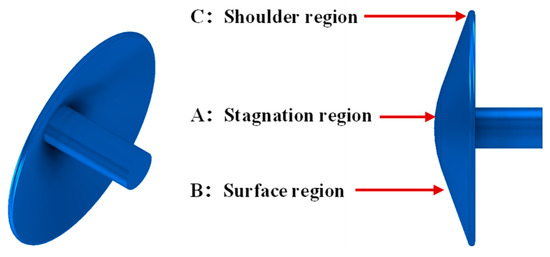 The test data of Inflatable Reentry and Descent Technology (IRDT) conducted by JAXA [35] in 2017 is used as a reference to verify the numerical model adopted by this paper. In addition, IRDT and ADEPT had a similar configuration and heat flux distribution; however, IRDT had more abundant test data. The 3D models of IRDT and ADEPT were established, as shown in Figure 1a; the clearer division of surface regions is shown in Figure 1b. In Figure 1a, three different regions are distributed at similar locations of the two 3D models. A—stagnation region locates at the vehicle head, B—surface region represents the main developing surface of the vehicle, C—shoulder region is in the area around the shoulder. As shown in Figure 1b, the highest heat flux value may occur at two peak points, which are the stagnation point located in region A and the shoulder point located in region C. The flight height H = 39 km, incoming Mach number Ma = 4, angle of attack α = 0°, and then the surface heat flux of the vehicle is calculated.