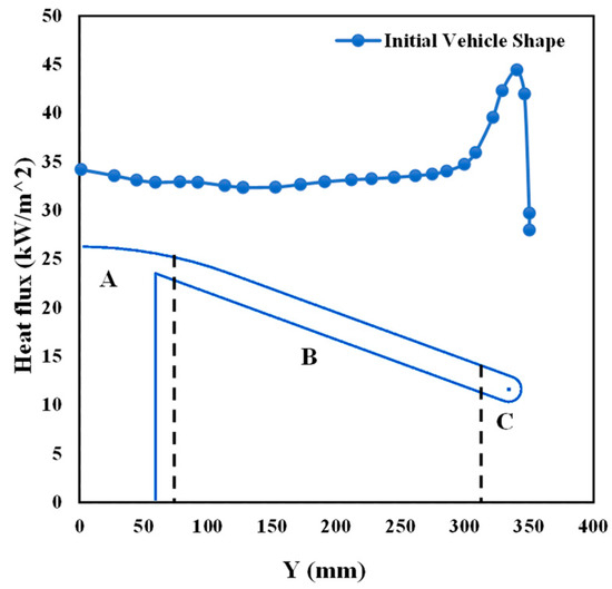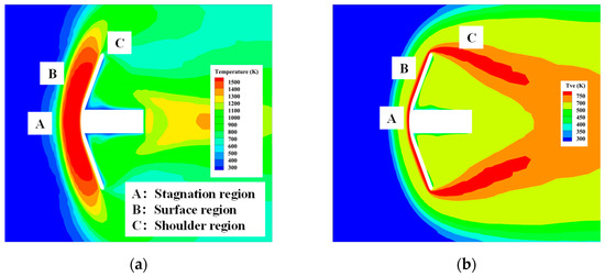 The flow field is divided into three regions (A/B/C) as explained in Figure 7a. In region A, the detached shock wave is formed before the head of the vehicle. Ttr in this region is higher than the other regions because the incoming air is heated strongly after passing through the shock wave. In region B, Ttr drops in gradient on the vehicle surface, but not appreciably. Then, in region C, a rapid flow separation occurs at the shoulder. Ttr has a large gradient increase, and the flow is more complex. Combined with Tve, there is also a separation in region C, with Tve increasing obviously at the shoulder. This shows that the incoming air expands rapidly in region C and increases the aerodynamic heating.