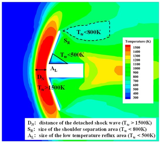 To further characterize the flow field details of the reentry vehicle, three characteristic parameters shown in Figure 8 were chosen to compare and analyze the temperature contours. These exist in the stagnation point region of Ttr > 1500 K. SR shows the size of the shoulder separation area where Ttr < 800 K. AL denotes the size of the low temperature reflux area, which is close to the wall and Ttr < 500 K. These three characteristic parameters are different in different cases of flow fields, and their variation trend can help analyze the flow field and heat flux changes.