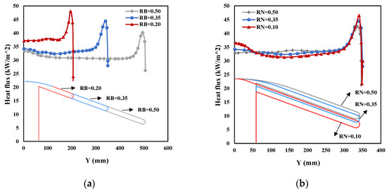 Heat flux distribution of case 0-0, case 1-1 to case 2-2: (a) RB is changed; (b) RN is changed.