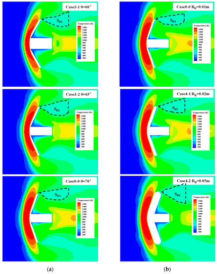 Temperature contours after changing the other two structural parameters RS and LZ are shown in Figure 14. They have no obviously direct influence on the complex flow field in the stagnation region and shoulder region; however, in surface area, AL represents the size of the low temperature reflux area where Ttr < 500 K; moreover, it also affects the heat flux distribution. The heat transfer effect of gas decreases at low temperature. When AL is large, the heat flux on the surface region of the vehicle will decrease slightly. AL decreases first and then increases when the base radius RS gradually increases. At the same time, increasing the total length LZ will continuously decrease AL. Increasing AL can also contribute to a reduction in aerodynamic heating.