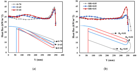 Heat flux distribution of case 0-0, case 3-1 to case 4-2: (a) θ is changed; (b) RR is changed.
