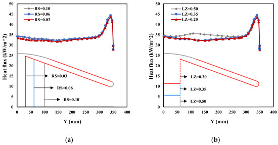 Heat flux distribution of case 0-0, case 5-1 to case 6-2: (a) RS is changed; (b) LZ is changed.
