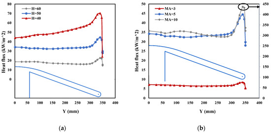 Heat flux distribution of case 0-0, case 7-1 to case 8-2: (a) H is changed; (b) Ma is changed.
