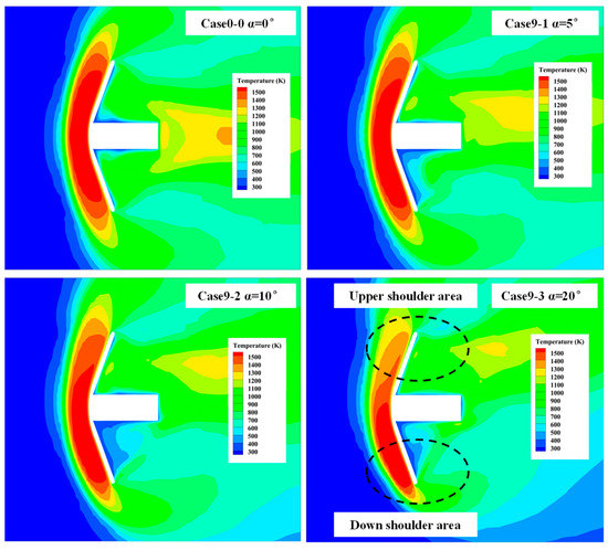 Figure 18 shows the temperature contours of case 0-0 and 9-1 to 9-3. During the reentry process with the attack angle α, the aerodynamic heating of the vehicle via the incoming air will not be symmetrical. With an increase in α, the deuterated shock wave near the stagnation point concentrates in the part opposite the incoming air, and the air expansion and separation in the down shoulder area are more obvious. The low temperature reflux area converges in the opposite air part. Therefore, aerodynamic heating mainly occurs in the shoulder region, which is opposite the incoming air, while the thermal environment of the other shoulder region is relatively mild.